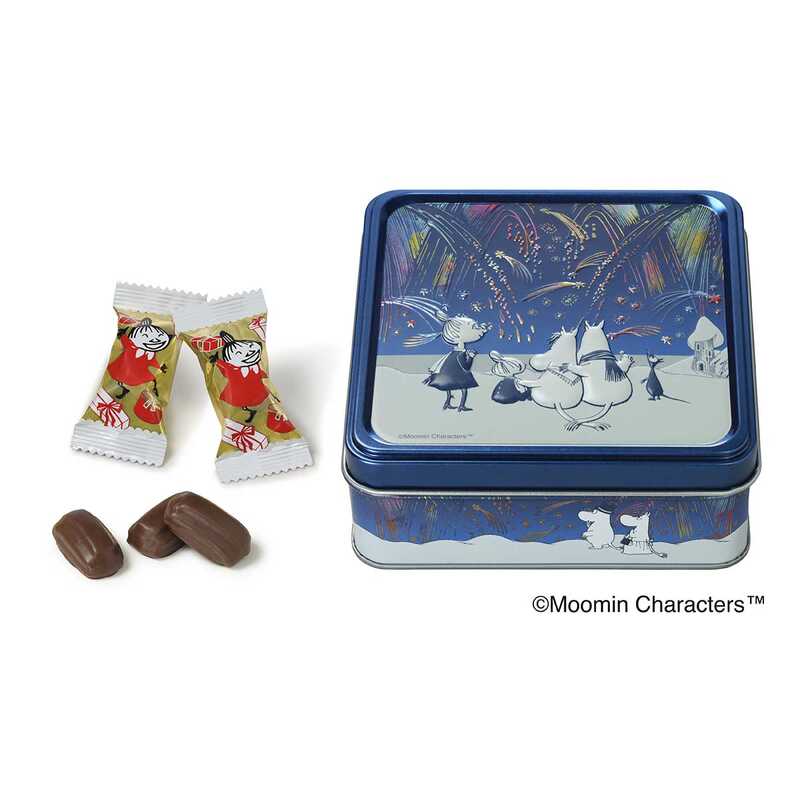 夜空の彩りを思い思いに楽しむムーミンたちが描かれた缶の中には、リトルミイの包装で包まれたチョコレートクッキーが入っています。