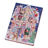 大きなお菓子の家でにぎやかにクリスマスを楽しむサンタさんや動物たちが描かれたアドベントカレンダー。扉の中にはチョコレートのお菓子が入っています。何が入っているかはおたのしみ!