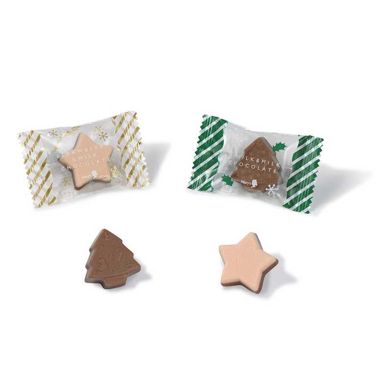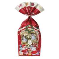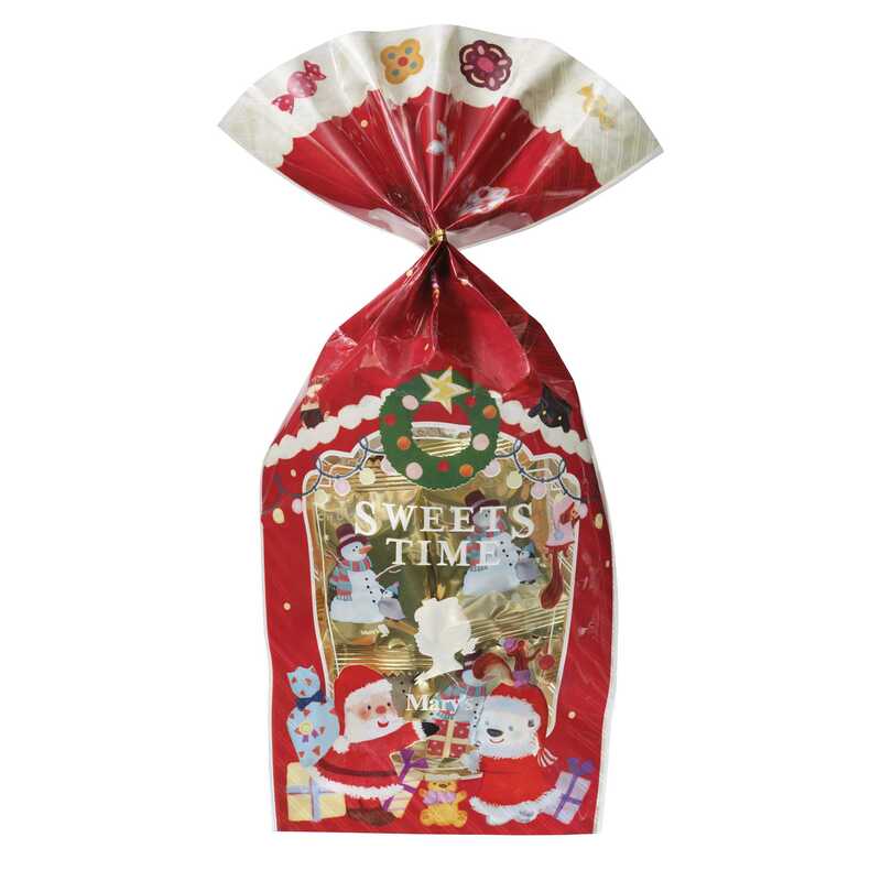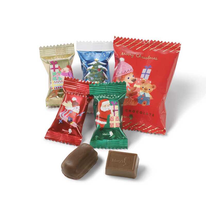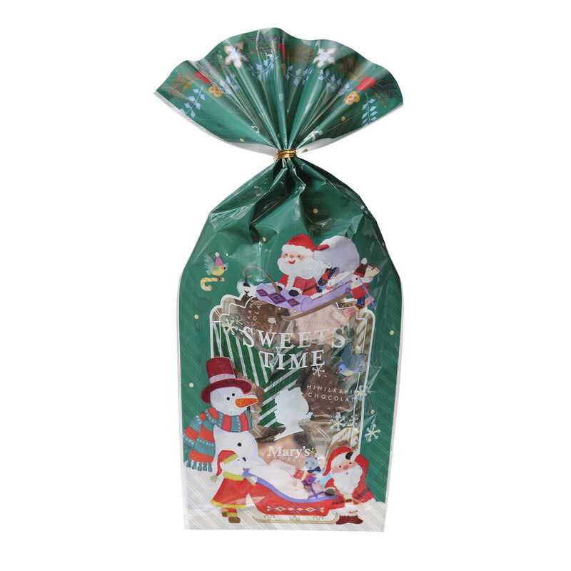クリスマス気分を盛り上げるサンタさんやスノーマン、ベアが描かれた袋に、クリスマスモチーフのかわいいチョコレートのお菓子が入っています。
