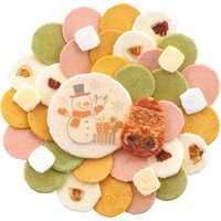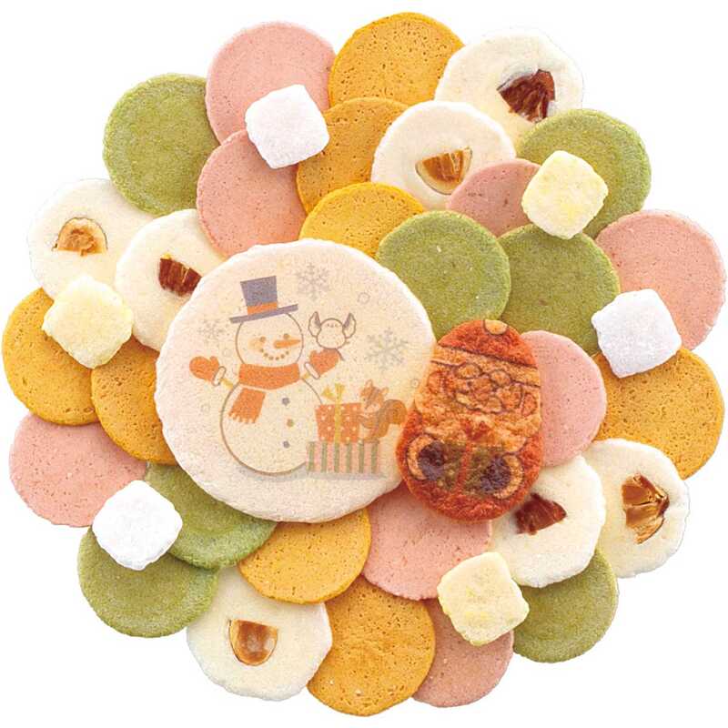 - 36g(標準入数40枚)入 雪だるま柄えびせんべい、サンタ型赤えび炙り焼き、抹茶えびせんべい、南瓜えびせんべい、アーモンドえびせんべい、苺えびせんべい、砂糖松風(白)、砂糖松風(黄)