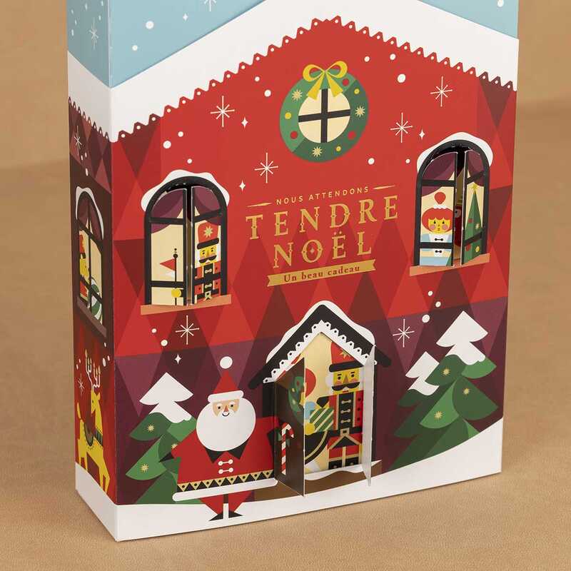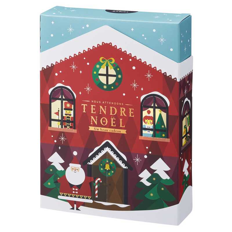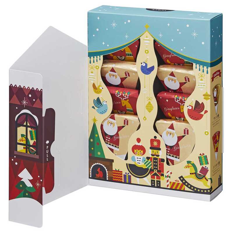 クリスマス限定デザインのゴーフレールを詰め合わせ8個入セット。扉を開けると部屋の中から人形たちが顔を出します。