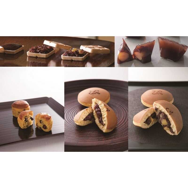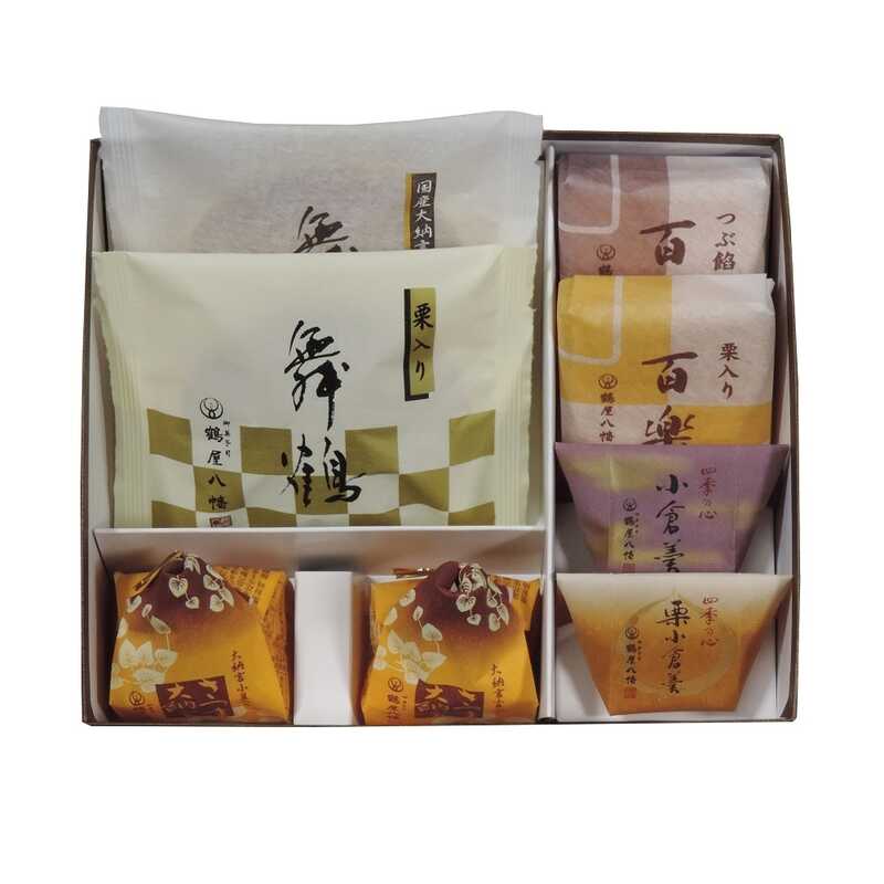 - 百楽(粒あん、栗入各1個)、舞鶴(粒あん、栗入各1個)さつま大納言2個、四季の心(小倉羹、栗小倉羹各1個)