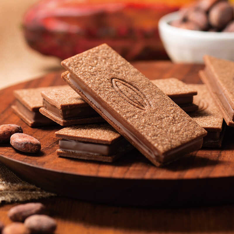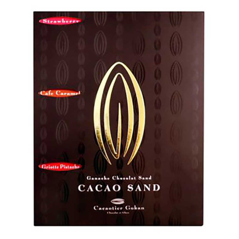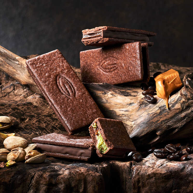 カカオティエゴカンの人気のチョコレートサンド。カカオの産地や風味にこだわったガナッシュチョコレートをサクサクのサブレでサンドしました。コクのあるホワイトチョコレートにイタリア・スペイン産のピスタチオと洋酒に漬け込んだグリオットチェリーを練り込んだ「グリオットピスターシュ」、カカオ感のあるスイートチョコレートにキャラメルとコーヒーを合わせたほろ苦い風味のガナッシュをサンドした「カフェキャラメル」、優しい甘さのミルクチョコレートとホワイトチョコレートに甘酸っぱい苺のコンフィチュールを合わせた「ストロベリー」の詰合せ。