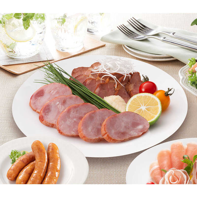 - 特選燻しポークハム180g、やわらか焼豚185g、生ハム45g、特選あらびき燻しウインナー80g×3