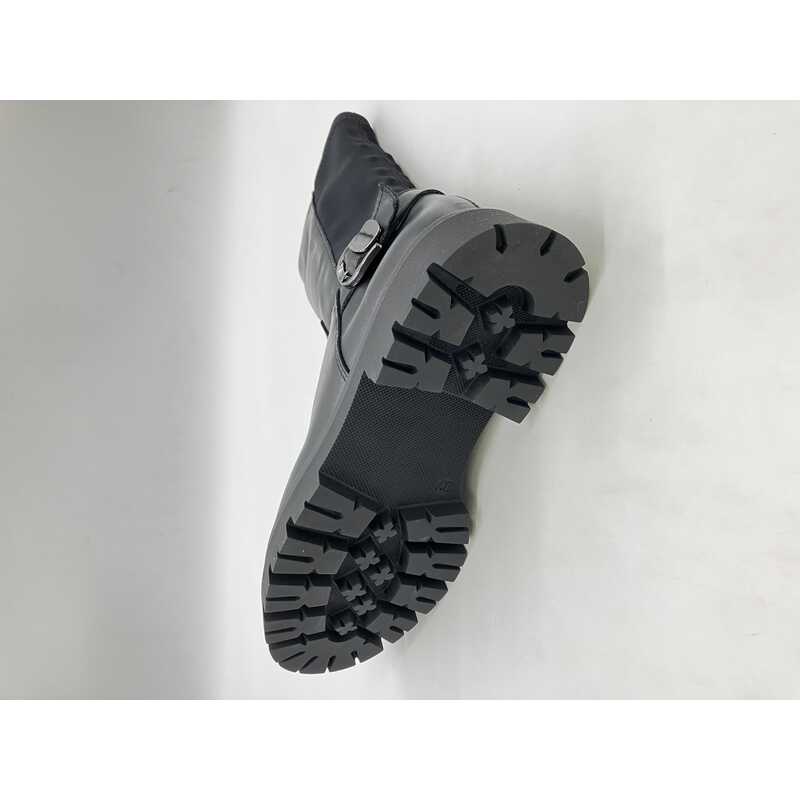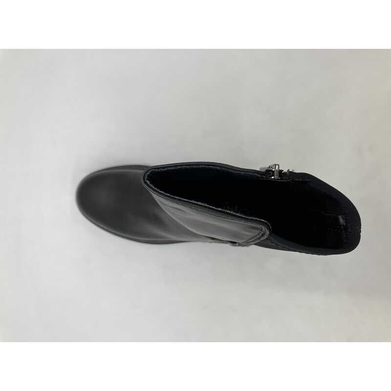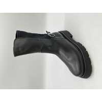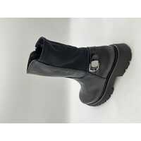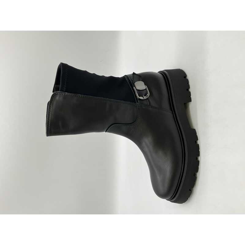 ふくらはぎ部分にストレッチ素材を使い、フィット感が特徴のショートブーツです。サイドに配置したかざりベルトがスタイリッシュな印象を与えます。内側ファスナーで着脱も容易です。