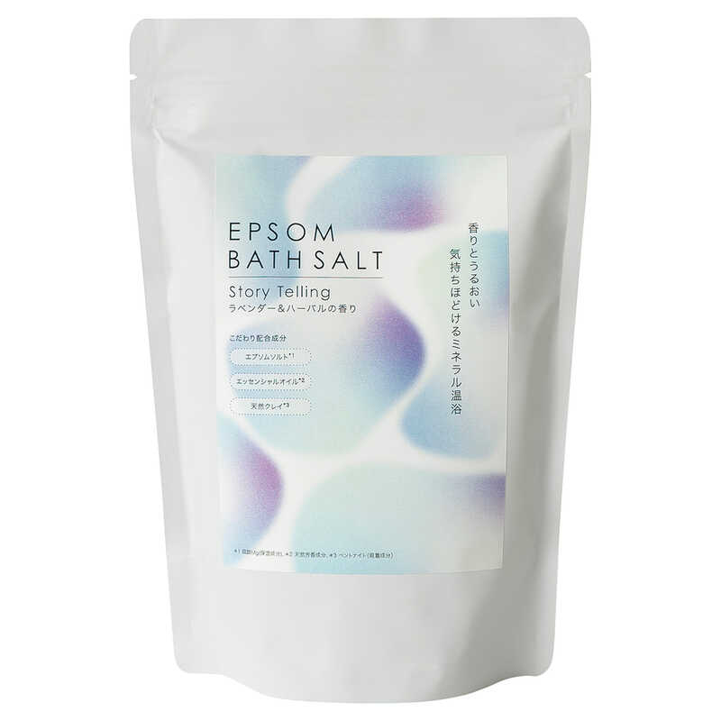 エプソムソルト(硫酸Mg※保湿成分)をメインに、エッセンシャルオイル※天然芳香成分、天然クレイ(ベントナイト※吸着成分)を合わせました。約10回分の大容量サイズ。計量用のスプーン付きです。入浴により体を温め、肌を柔らげしっとりなめらかな肌へと整えます。ストーリーテリング~ラベンダー&ハーバルの香り~香りとうるおい 気持ちを満たすミネラル温浴.◯天然由来の香り:南仏ラベンダーにコモンセージ、甘い半日花(シスタス)と爽やかな芳樟(ホーリーフ)でゆったり時間のスイッチON。穏やかでアットホームな香り。◯湯色:透明【合成香料、合成着色料、エタノール、鉱物油、防腐剤不使用】