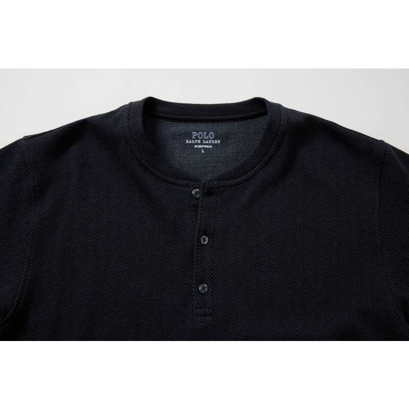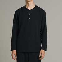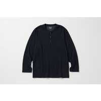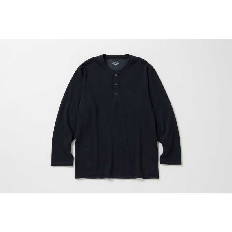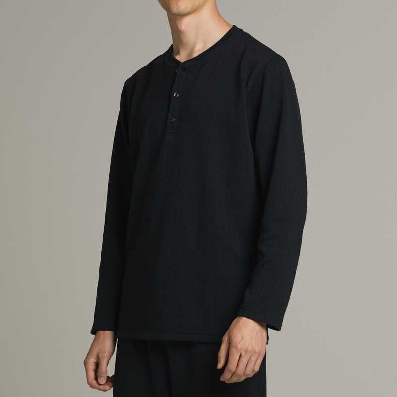 環境に配慮されたリサイクルポリエステルにコットンとポリウレタンを混紡した、保温性とストレッチ性に優れた素材によるロングスリーブヘンリーネックシャツです。