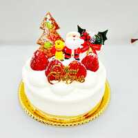 しっとりと焼き上げたスポンジケーキに生クリーム、黄桃、洋なしをサンド。いちごやクリスマスオーナメントを飾り、可愛らしく仕上げました。