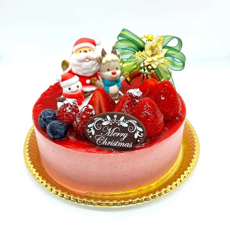 フランボワーズのムースをクリスマス限定でデコレーションケーキに仕上げました。中には温州みかんのクーリーをはさみました。