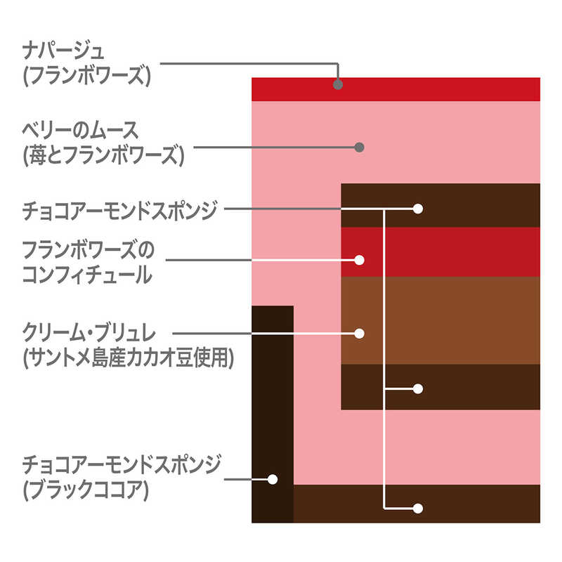 甘酸っぱいベリーのムースでフランボワーズのコンフィチュールとショコラのクリームブリュレを包みました。苺とフランボワーズのやさしい酸味が濃厚なチョコレートの甘さを引き立てる、華やかな味わいです。
