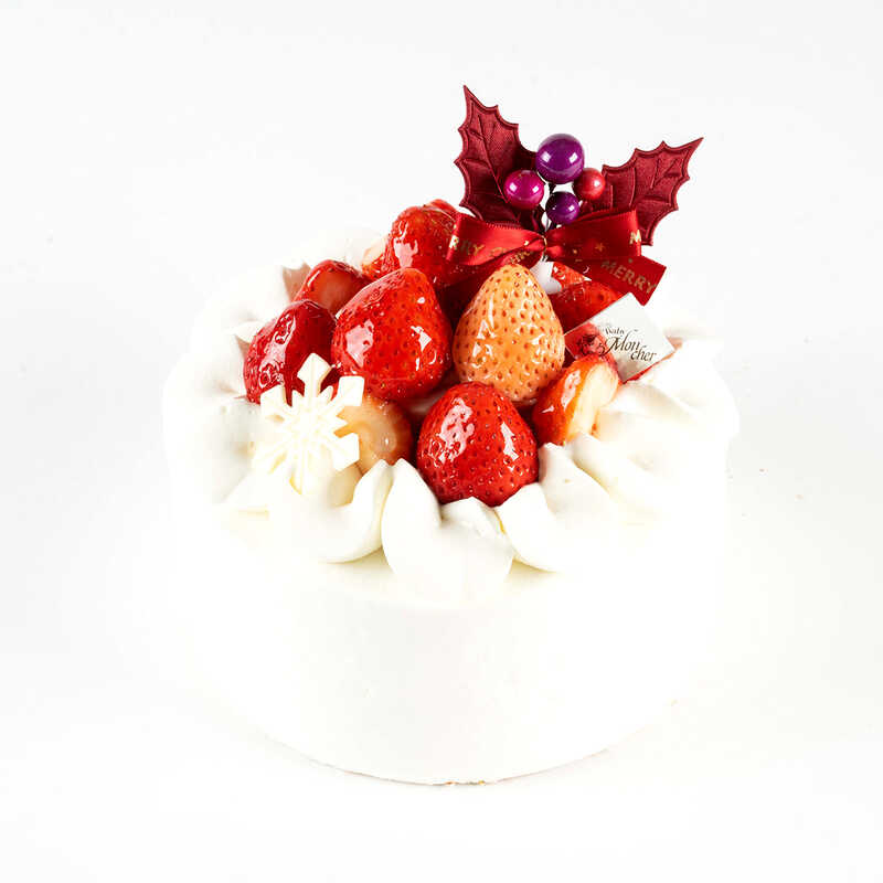 生乳のコクと香り広がる「堂島ロール」のクリームに、赤と白、2種のいちごが映える、王道アントルメ。しっとりふわふわに焼き上げた生地はクリームの味わいを引き立たせるため甘さをひかえたやさしいくちどけに。雪が舞う森の中でキラキラと光る1本のクリスマスツリーをイメージした、聖夜にふさわしい華やかなデザインに仕上げました。