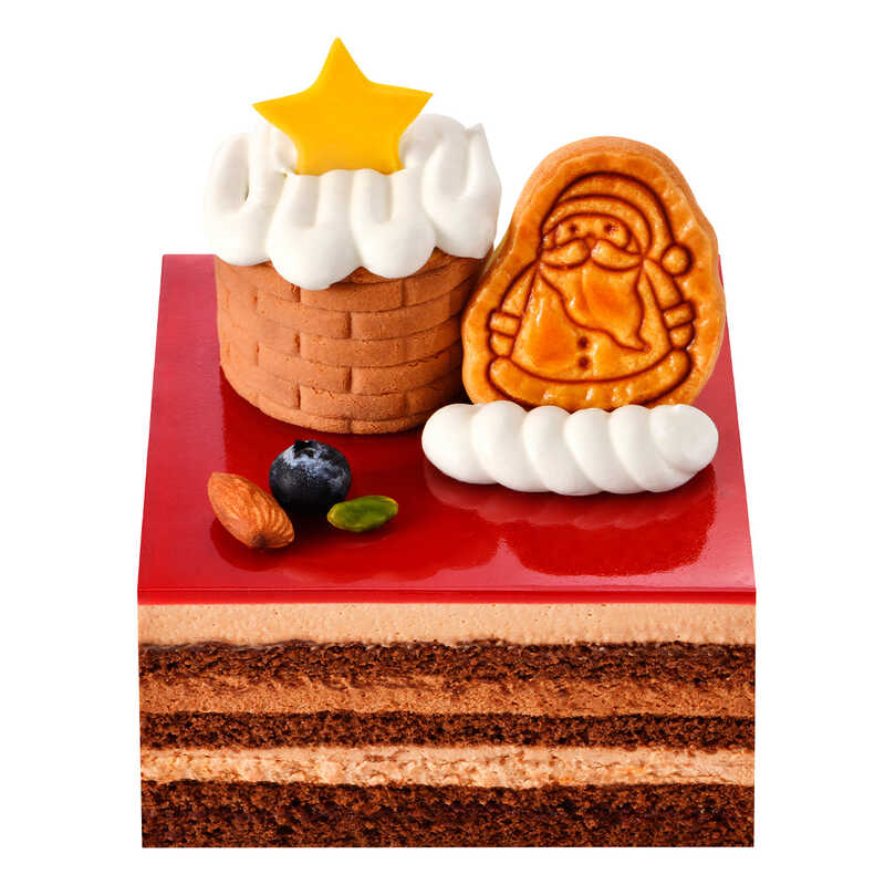 濃厚なチョコレートムースとラズベリーの酸味がポイント。可愛らしいサンタのビスケットと煙突をあしらいました。