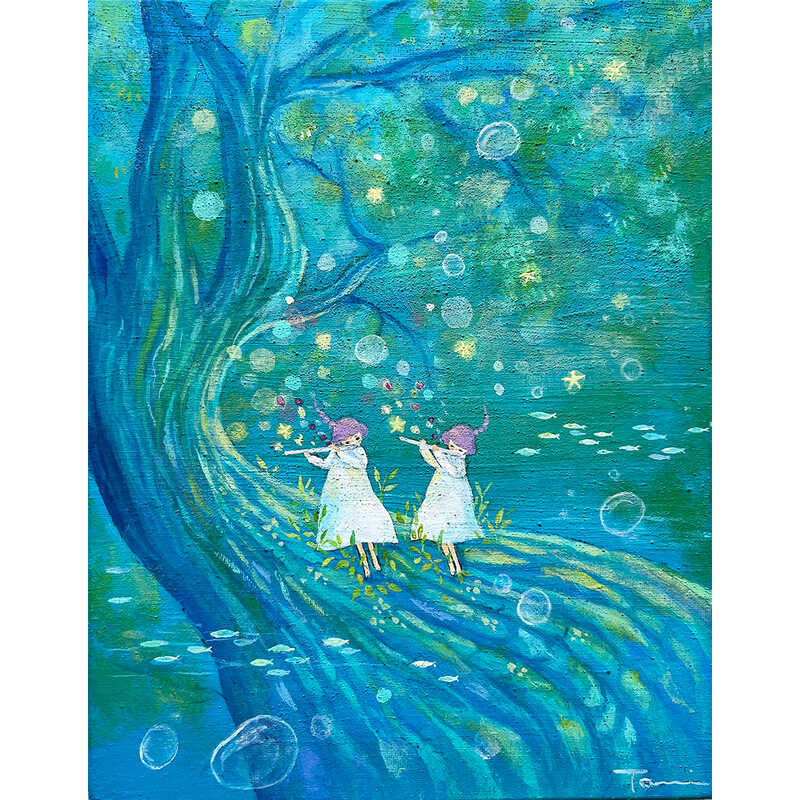 アクリル絵具を使用し、主にあたたかなアカリ・光をテーマに制作。