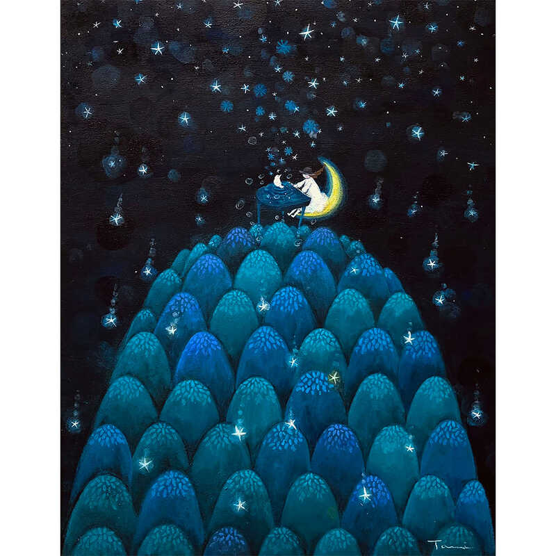 アクリル絵具を使用し、主にあたたかなアカリ・光をテーマに制作。