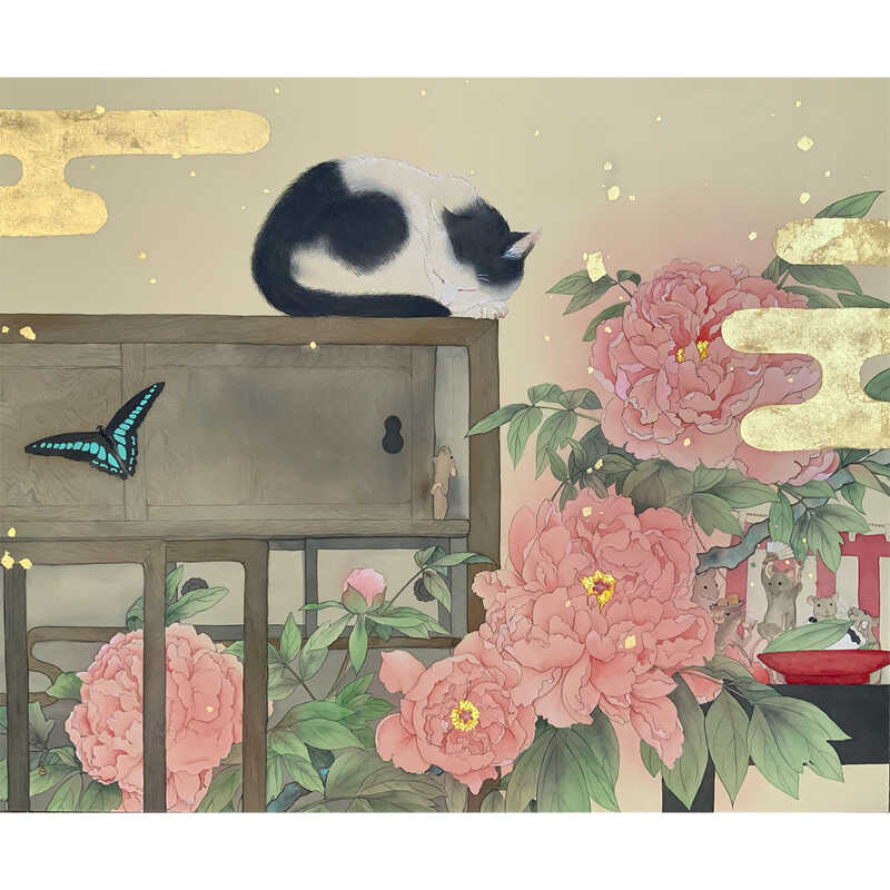 岩絵具、水干絵具、墨、胡粉、顔彩、箔、絵絹、木製パネル