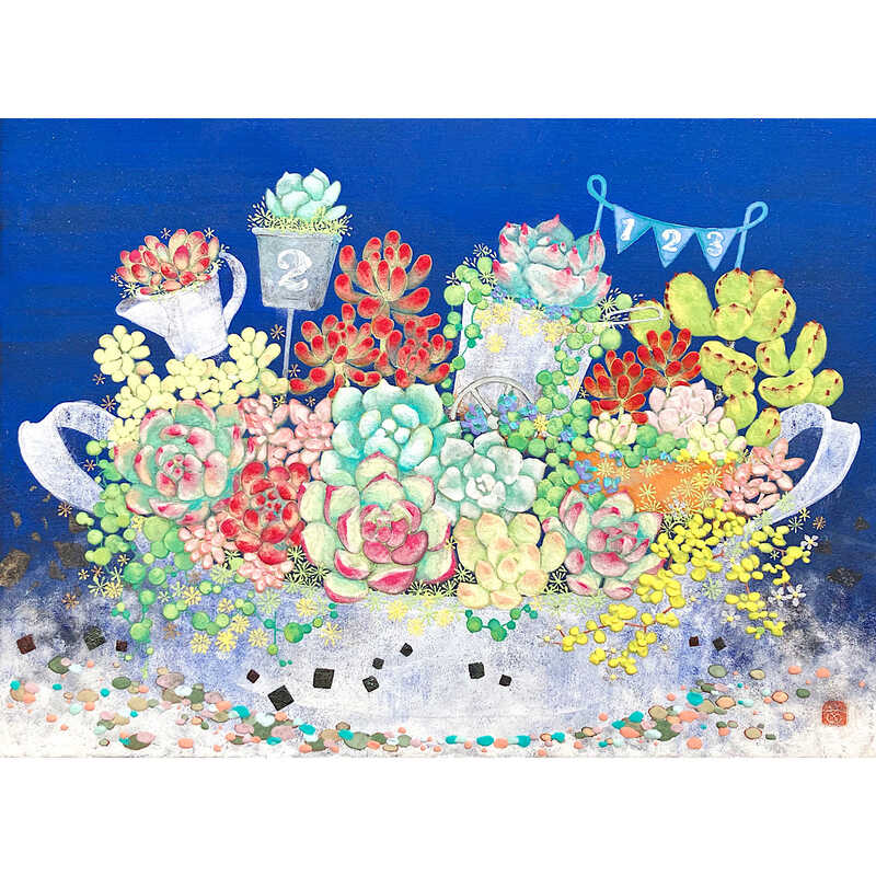 自分らしく生きたいと願いつつも中々難しい現代の自分達の光明となるよう、ただそこに生きる植物達の在りのままの姿を、岩絵具の美しい色を尊重しながら描く。