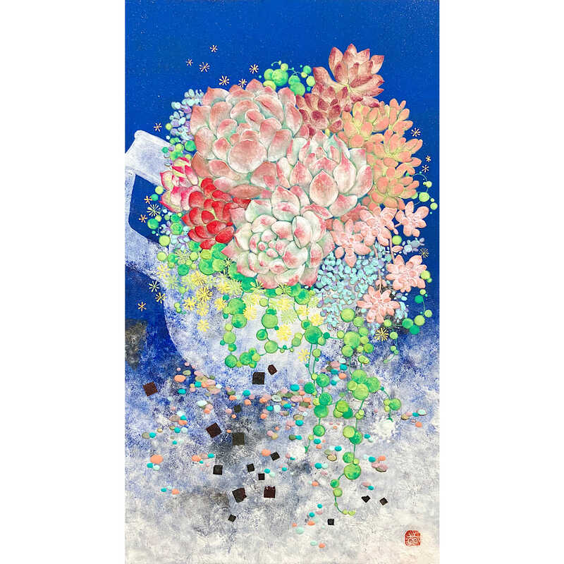 自分らしく生きたいと願いつつも中々難しい現代の自分達の光明となるよう、ただそこに生きる植物達の在りのままの姿を、岩絵具の美しい色を尊重しながら描く。