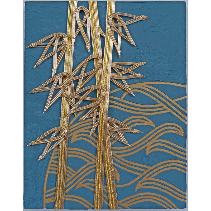 水引、アクリル、メディウム、ワイヤー、木製パネル
