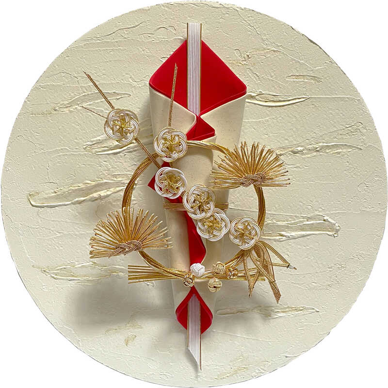 水引、アクリル、メディウム、粘土、ワイヤー、キャンバス
