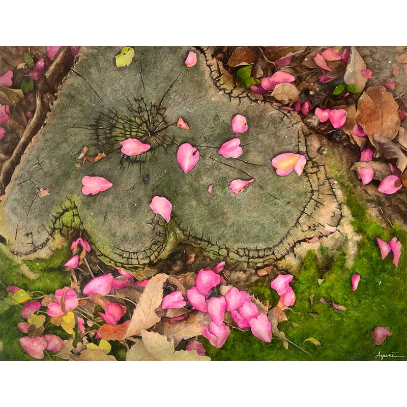 アクリル絵の具、色鉛筆、箔などを使用し、一瞬一瞬しか存在しない自然の中の小さな景色との出会いを大切に、自然の落ち物と地面、植物を中心に「偶然性と神秘」を制作のテーマとして侘び寂びや温度を纏う世界を描く。