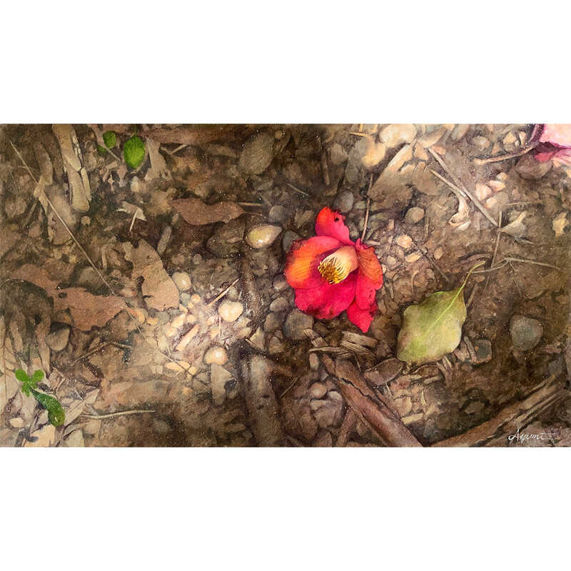 アクリル絵の具、色鉛筆、箔などを使用し、一瞬一瞬しか存在しない自然の中の小さな景色との出会いを大切に、自然の落ち物と地面、植物を中心に「偶然性と神秘」を制作のテーマとして侘び寂びや温度を纏う世界を描く。
