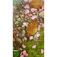 アクリル絵の具、色鉛筆、箔などを使用し、一瞬一瞬しか存在しない自然の中の小さな景色との出会いを大切に、自然の落ち物と地面、植物を中心に「偶然性と神秘」を制作のテーマとして侘び寂びや温度を纏う世界を描く。