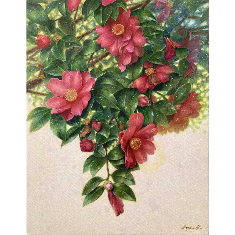 アクリル絵の具、色鉛筆、箔などを使用し、一瞬一瞬しか存在しない自然の中の小さな景色との出会いを大切に、自然の落ち物と地面、植物を中心に「偶然性と神秘」を制作のテーマとして侘び寂びや温度を纏う世界を描く。