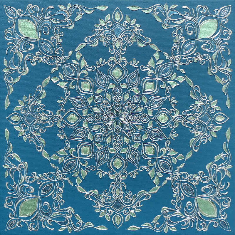 「美しく、繊細な、模様を介して、祈りとともに心情や情景を紡ぐ」を主テーマとして、アクリル絵の具を絞り出して半立体の繊細な模様を描き、煌めきや質感を組み合わせて作品を制作