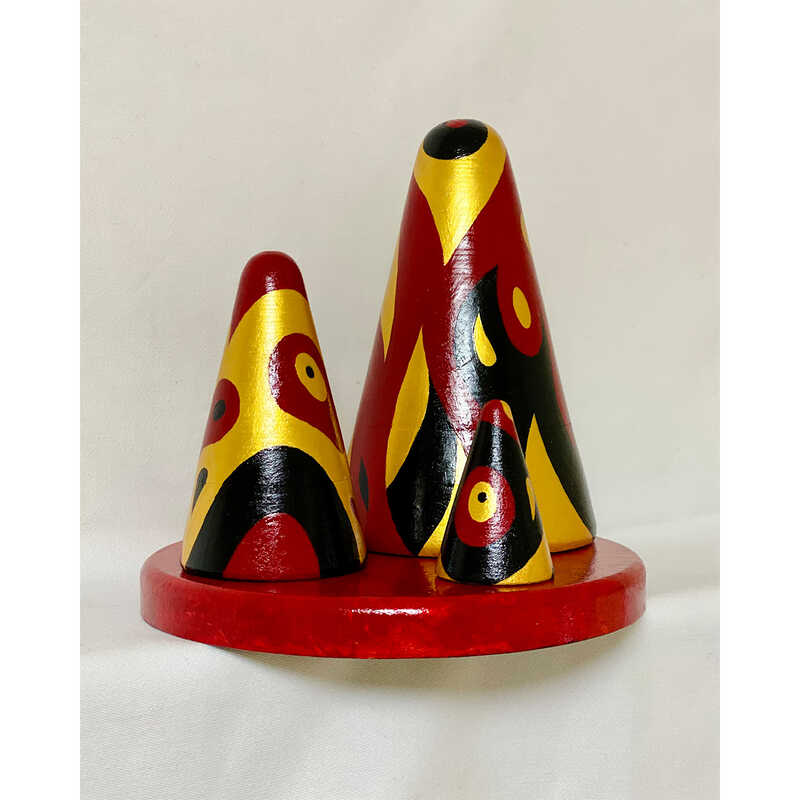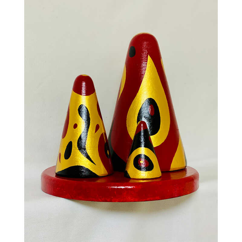 赤と黒の強靭な色彩を使い、絵画や立体など多岐に渡る作品を展開している。最近では民芸作品として、マトリョーシカや丸亀団扇など幅を広げている。