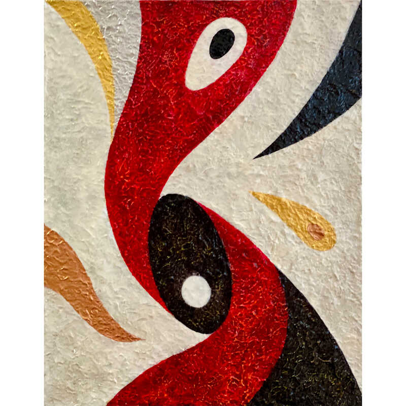 赤と黒の強靭な色彩を使い、絵画や立体など多岐に渡る作品を展開している。最近では民芸作品として、マトリョーシカや丸亀団扇など幅を広げている。
