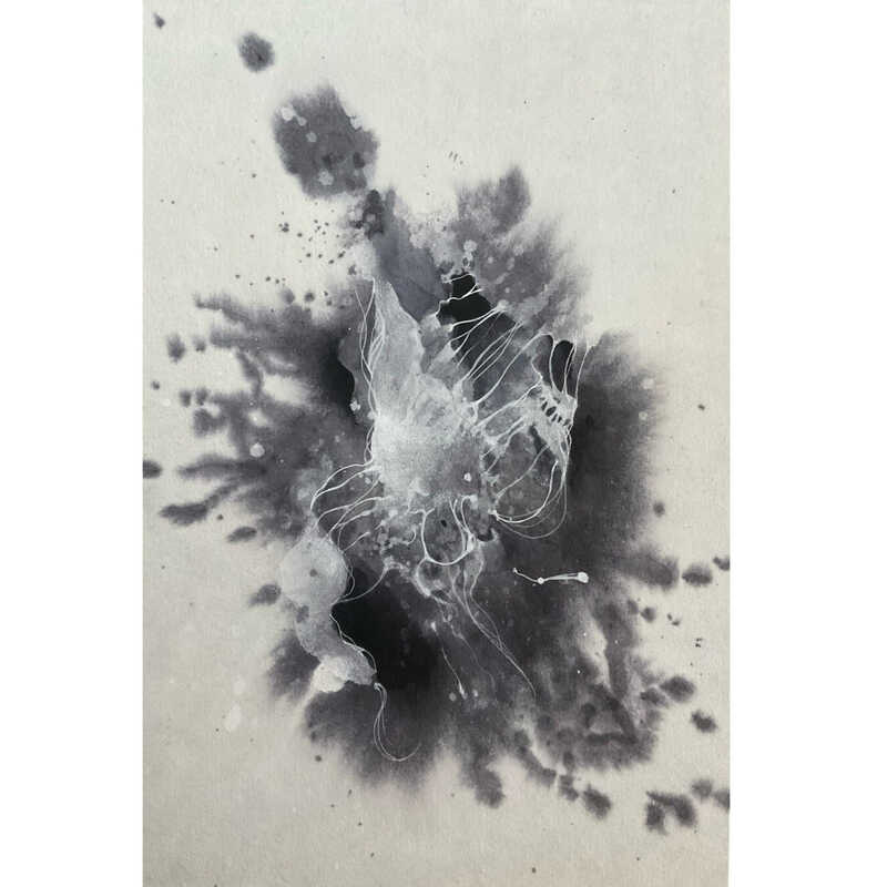 墨と胡粉、顔料等を使用し、偶発的にできた形に線を引くことで、なにかに成る過程のエネルギーの流動性を表現している。
