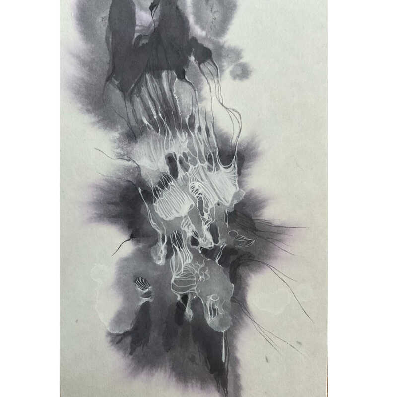 墨と胡粉、顔料等を使用し、偶発的にできた形に線を引くことで、なにかに成る過程のエネルギーの流動性を表現している。