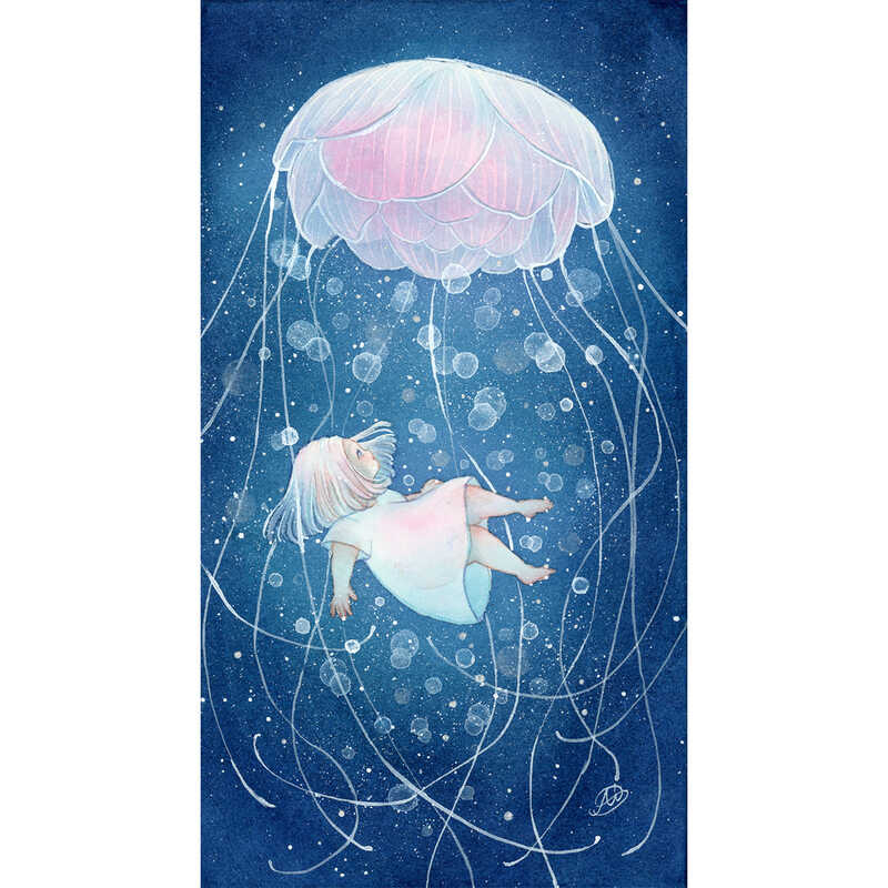 主に透明水彩絵具を使用し、夢と現実の間のような世界をテーマに作品を制作。