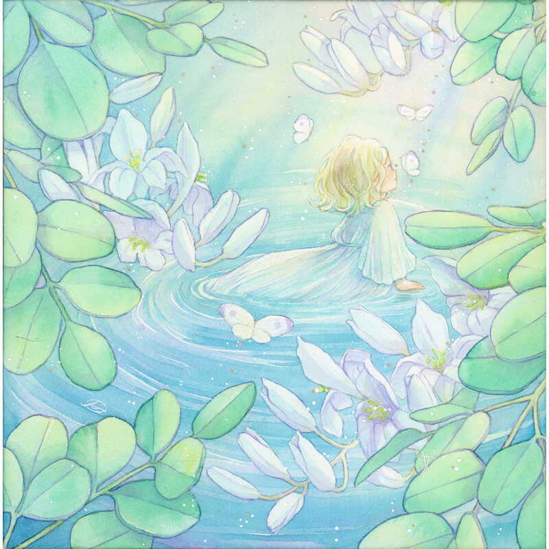 主に透明水彩絵具を使用し、夢と現実の間のような世界をテーマに作品を制作。