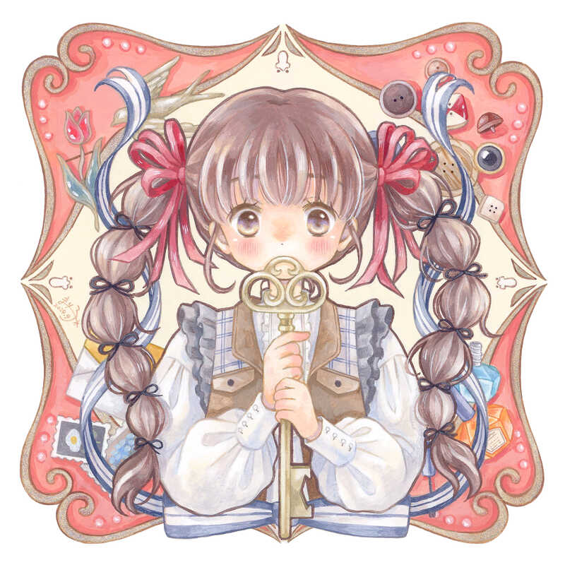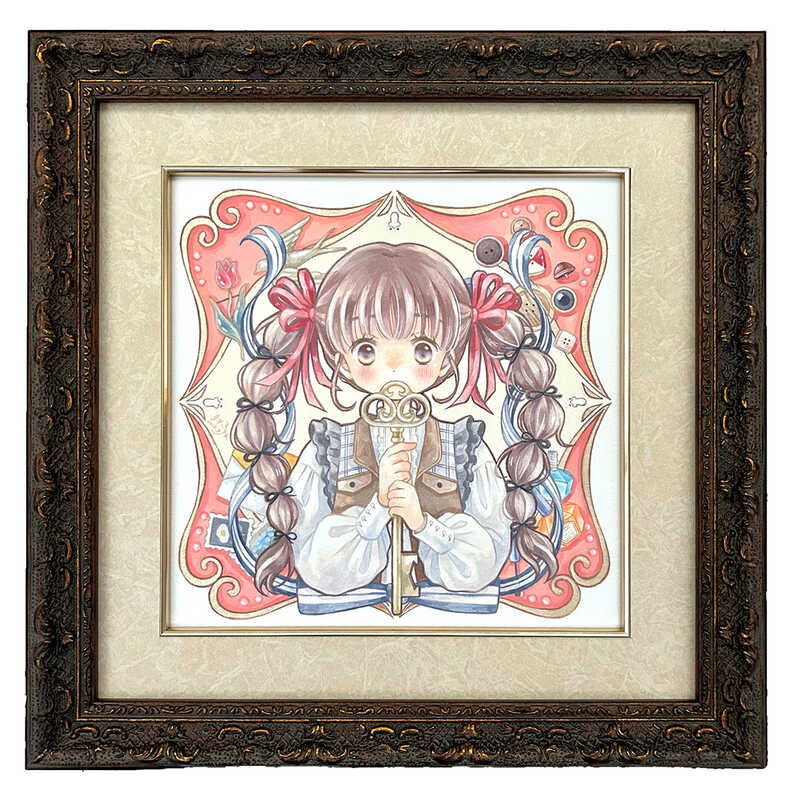 アクリル絵の具をメインに使用し、少女や動物、小物や植物等を好んで描きます。幼少期に憧れた子供目線のファンタジーな世界を作品に落とし込み、どこか懐かしさに浸れるような世界を生み出しています。
