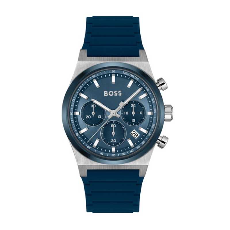 ブルーシリコンストラップが印象的なクロノグラフ付き時計です。