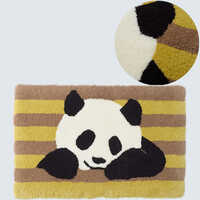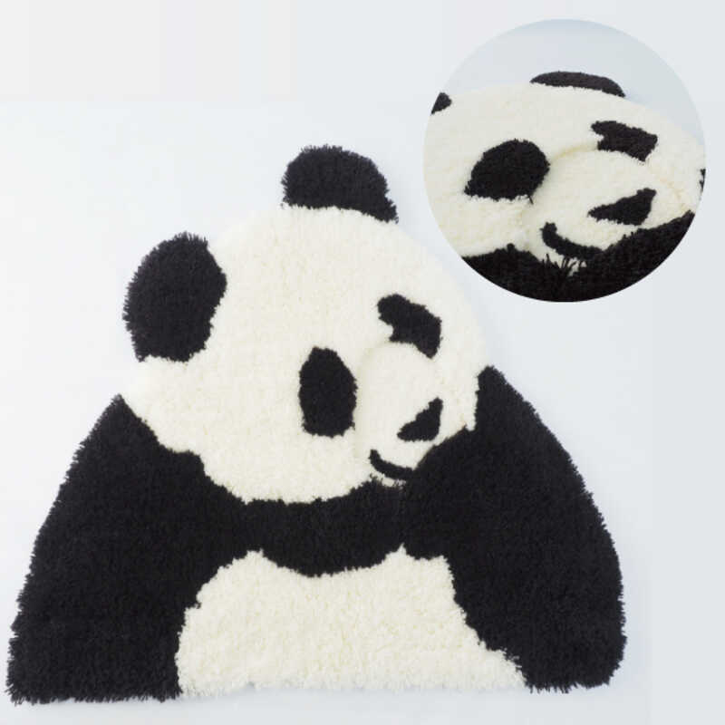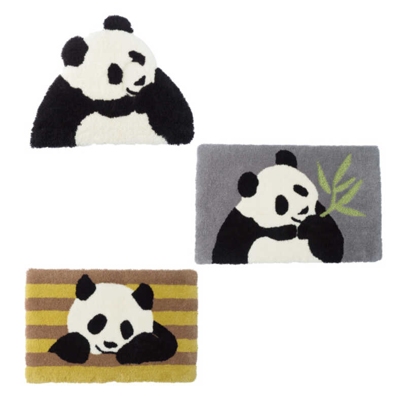 愛くるしいパンダの表情をかたどり口元のエンボス加工で特徴を表現した「ビッグパンダ」、こちらをみつめる「おねだりパンダ」、好物の笹竹をほおばる姿を表現した「くいしんぼうパンダ」のセットです。1点1点手作業でパイルを基布に植え付けていくハンドフック仕様で機械とは異なる独自の風合いがあります。