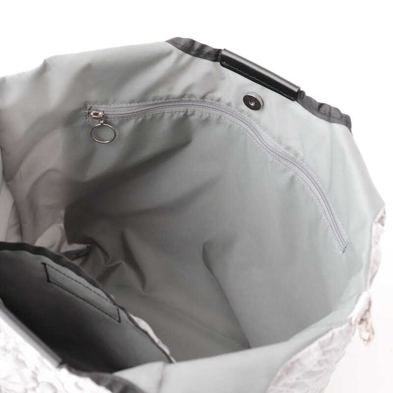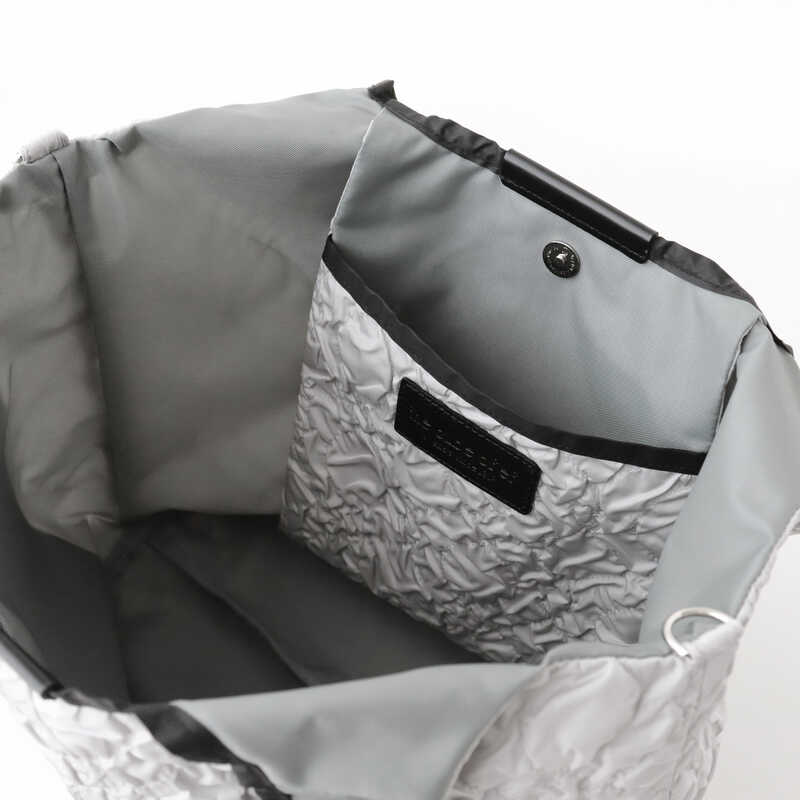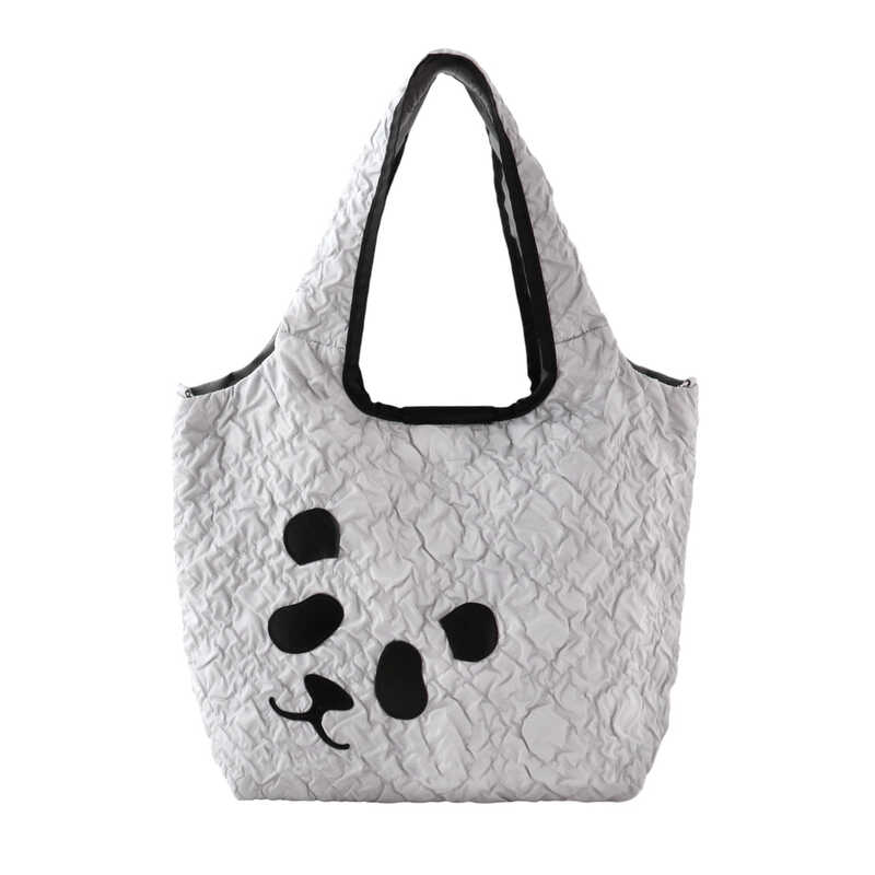 表面に革パッチでパンダを表現した、大人のパンダバッグです。軽量で薄手のナイロンに収縮キルトを施した独特なシワ感が特徴的なバッグ。軽量でもたっぷり収納可能な上に表情豊かな素材感との相乗効果で、デイリーバッグとしてもエコバッグとしても活躍できます。トートバッグの開閉はマグネット仕様。お財布や貴重品の収納用に袋中ファスナーポケットが付いています。収納が少ない時には、両サイドの金具を留めてすっきりとボリュームダウンできます。